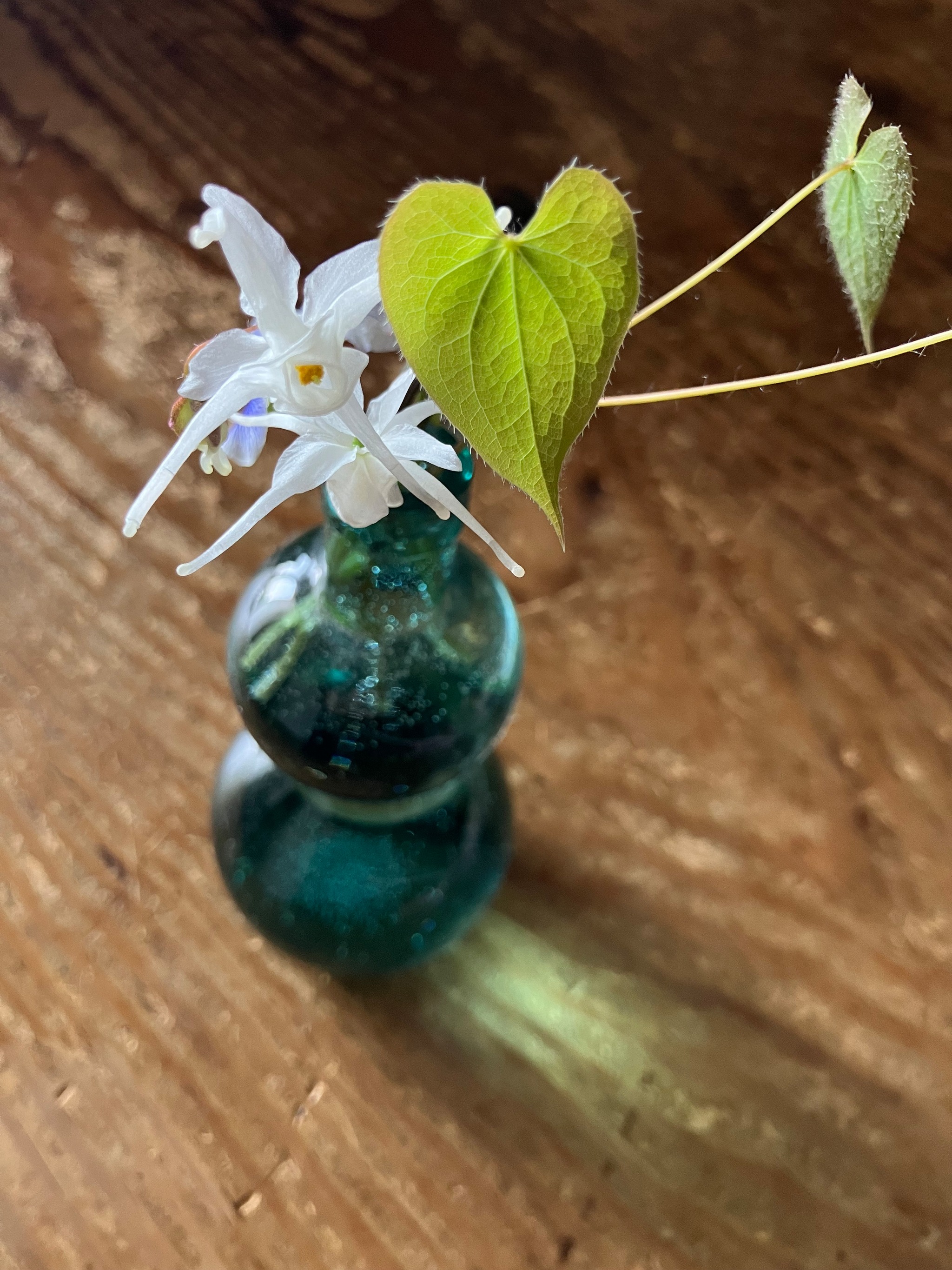 写真は今朝咲いていたイカリソウと菫です。