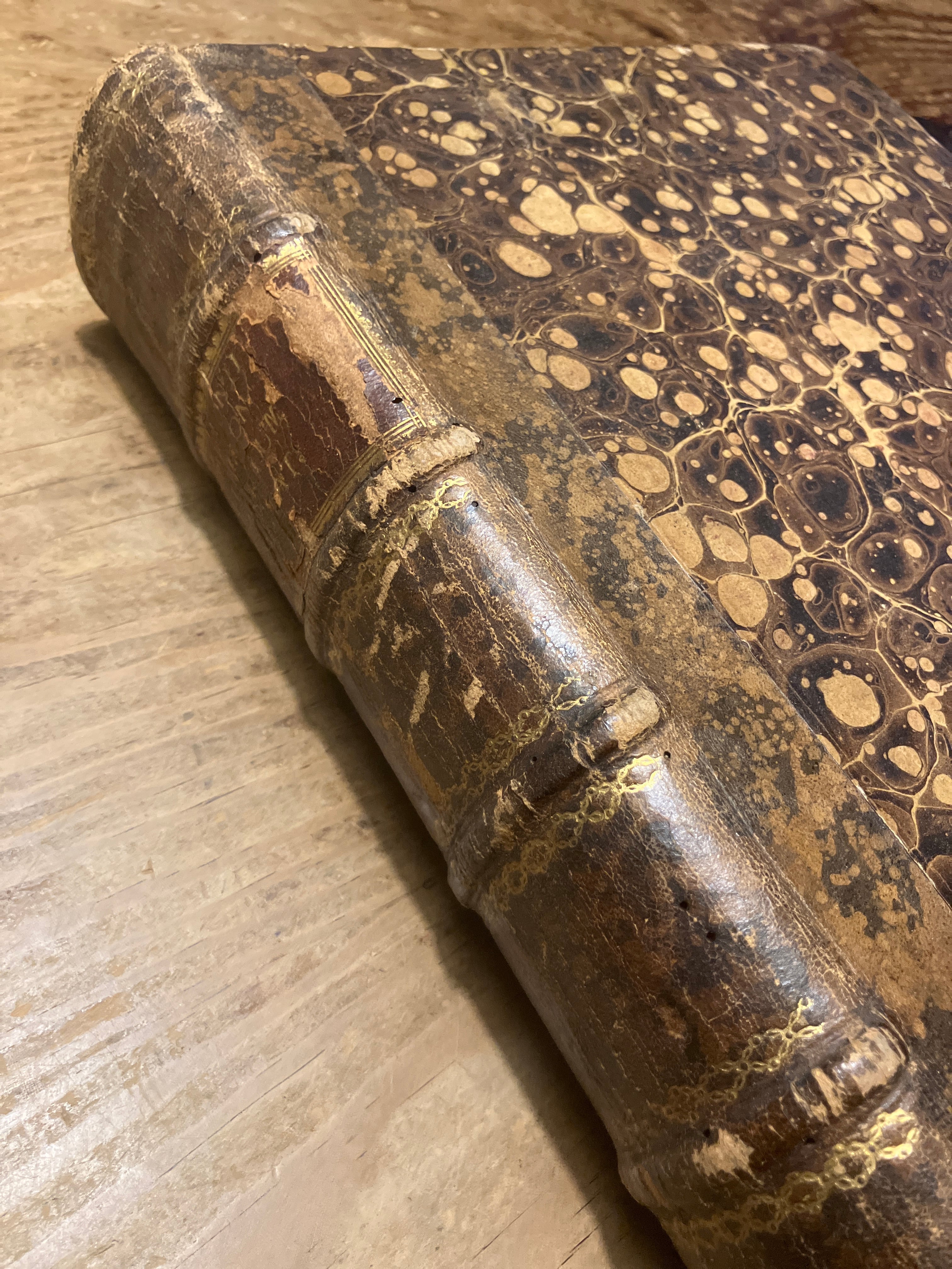 Contemporary quarter leather, marbled boards, gold-embossed title with brown leather on spine, 5 raised bands, edges brushed in red, spine rubbed, some wormholes in inner hinge, text a bit browning and foxing, else very good.